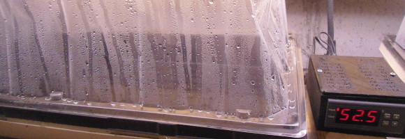 The whole assembly is supported by some scrap 1″ thick pieces of pine left from building beehives over the usual trays on my growlight assembly.