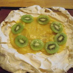 - When both the meringue base and the lemon curd have cooled pour the curd into the center of the meringue base and distribute. Top with fresh fruit if desired.